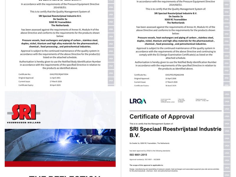 Lees verderDoor jarenlange ervaring en het continue streven naar innovatie in engineering, fabricagetechnieken, kwaliteitscontrole en organisatie, is SRI gecertificeerd voor PED/CE Module H/H1, ASME U&R Stamp, SELO en ISO 9001. Dit maakt ons een betrouwbare partner voor velen , veelal vaste klanten in binnen- en buitenland.